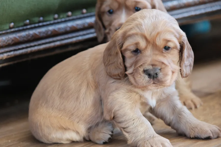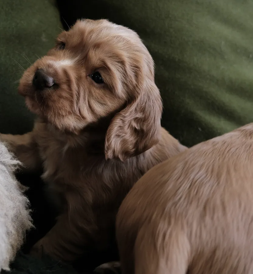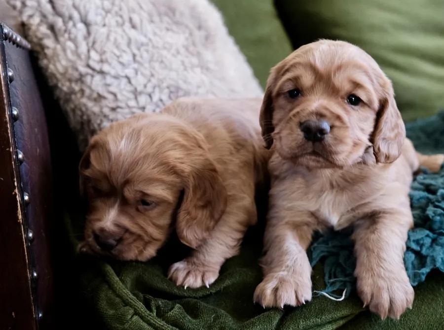 We have two English Cocker Spaniel dog puppies available to be viewed. Both are a golden red colour. Both are handsome big boned types with a deep square muzzled and boxy frames. They already have nice action and style and would make lovely hunting dogs, their breeding credentials back this up.