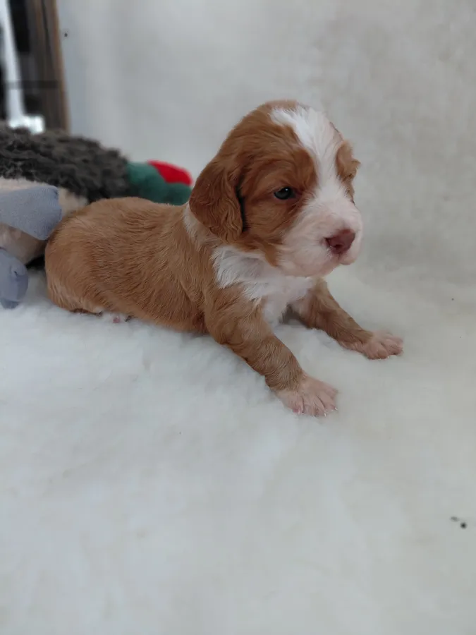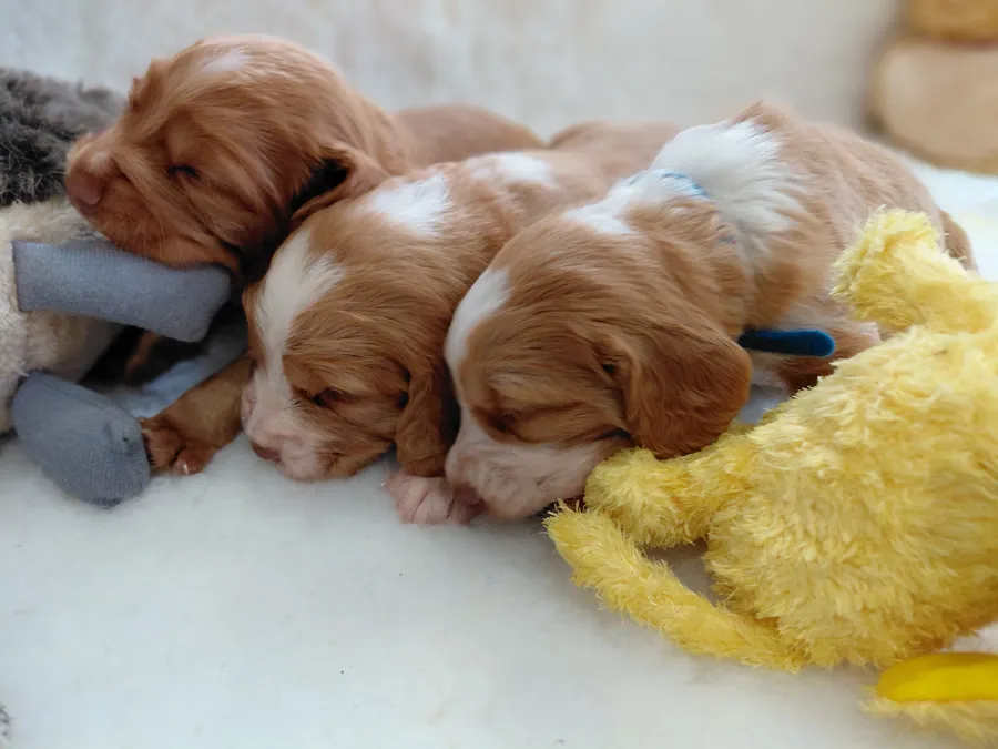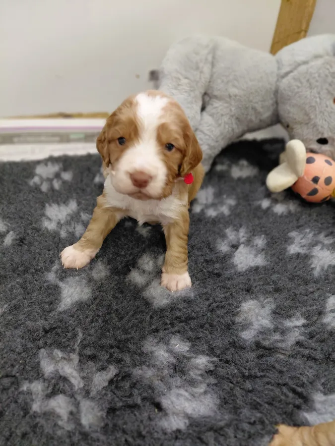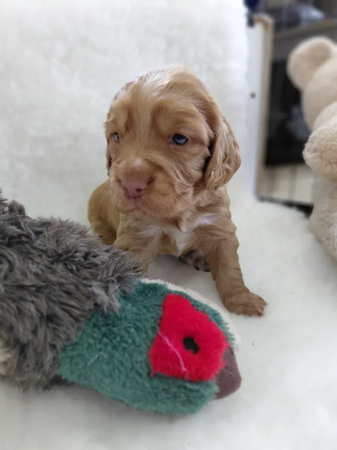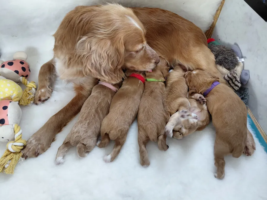 Golden and red working cocker spaniel puppies,born 11.09.25 , 6x lovely , healthy , strong and confident,well socialised,with people and our other 3 dogs. 3 bitches available. Pups will be vet health checked,microchipped,legally docked and dew clawed , regularly wormed and flea treated .