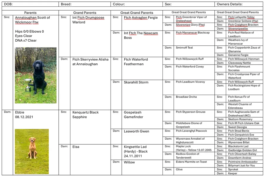 Sire FTW Annaloughan Scott of Wickmoor; is KC and fully health checked with Hips 0/0, Elbows 0, Eyes Clear, DNA x7 Clear