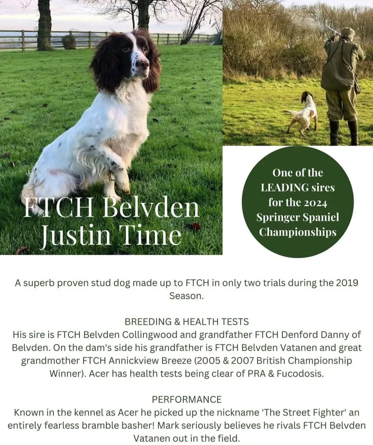 Sired by Field Trial Champion Belvden Justin Time, one of the leading Springer Spaniels in the UK. A beautiful strong and powerful dog with a lovely temperament.