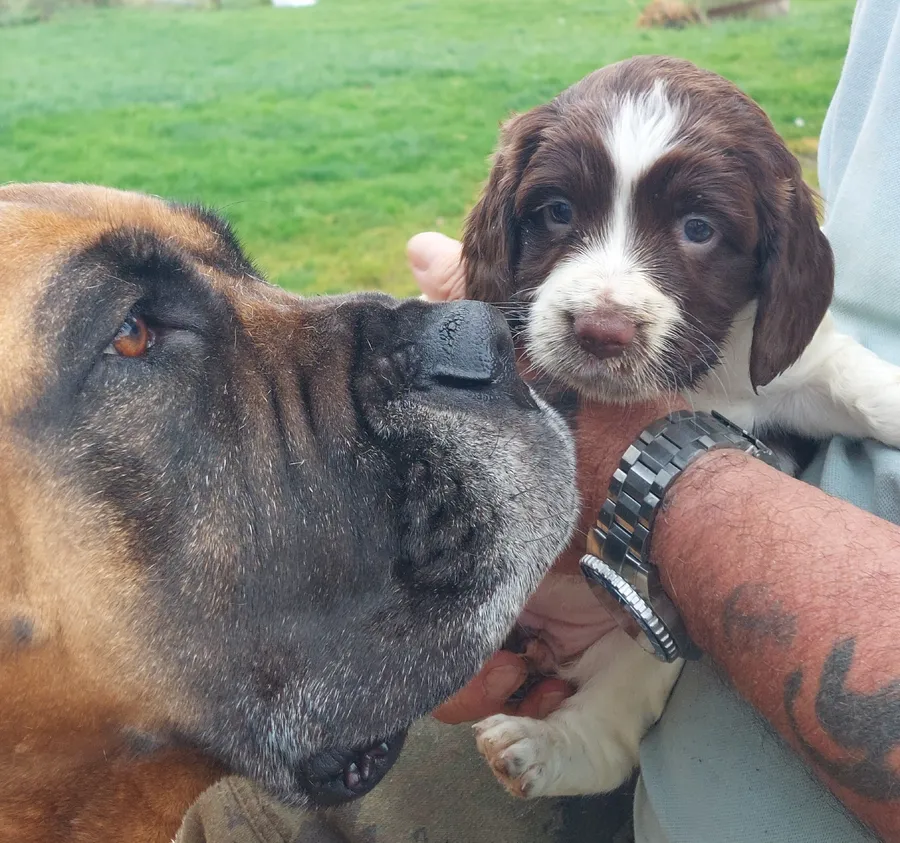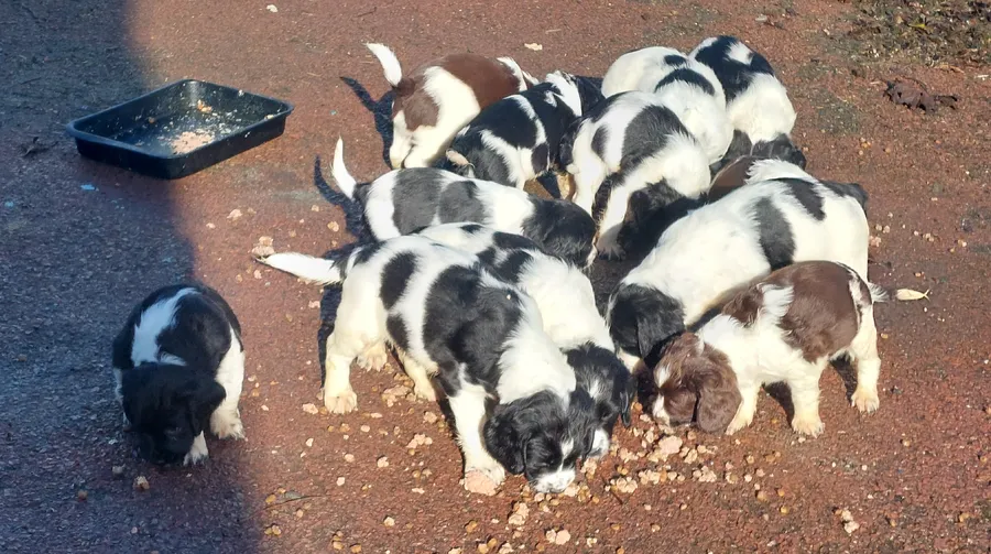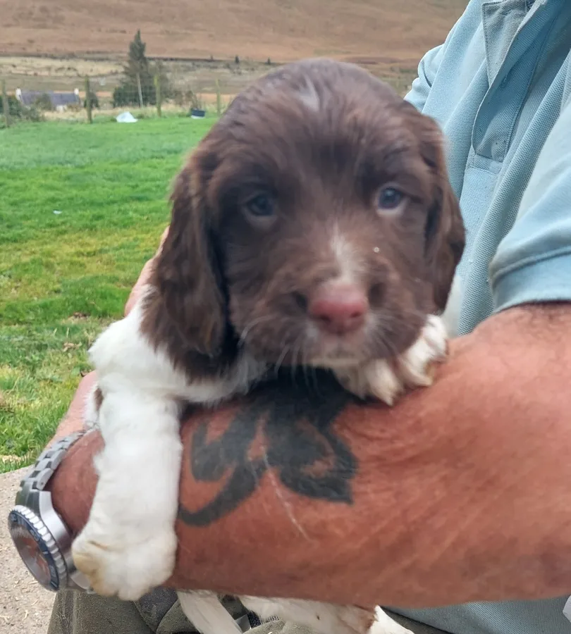 Here we have available males and females,liver and white and black and white to go to good family homes.Some pups are already booked,a deposit secures when you choose your puppy. Ready to leave from Nov 6th. Mum Elfie is here and dad Finn is only a mile away. Elvie is a small black and white,Finn is the liver and white. Both parents have excellent working pedigrees and temperament of both are solid and friendly.. Pups and mum have been health checked at home by our vet,Two Rivers of Biggar and are chipped and had first vaccination. Pups are KC registered with Elvis song titles being the theme for this litter. Pups are wormed to date with Panacur at 3 and 5 weeks and will be done again every 2 weeks until.11 weeks old. Flea and tick treatment with fipronil done at 6 weeks too. Pups are very well socialised with the other spaniels and big dogs,they love listening to Greatest Hits Radio or their Sound Sociable CD. All puppies and mum fed on Beta puppy and tinned loaf meat They also love evaporated milk and creamed rice and let's not forget their tuna and sardines! Pups come with food pack,toy,KC 5 generation pedigree,registration paperwork,puppy advice pack and puppy agreement. Genuine visitors only wanted,no photo collectors please,and no ody just out for a jolly day to cuddle the pups. All visitors are advised that we run cctv cameras around property. We are and have been top quality licensed breeders with South Lanarkshire Council for many years now with a successful annual visit each year. We have been with the same vet in Biggar since 2009. References on request.
