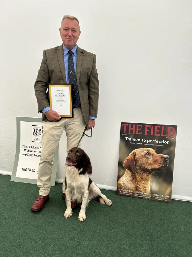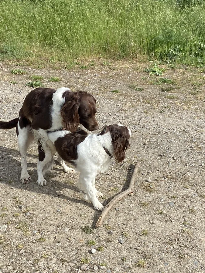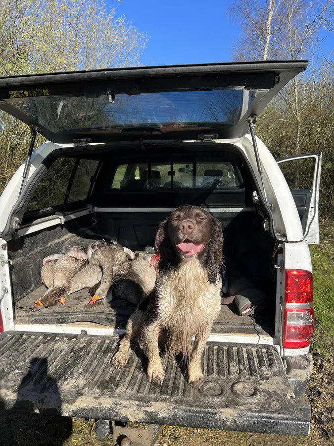 Very well PROVEN MALE with many bitches covered by him and producing strong even litters of pups. Averaging 8-9 pups per litter. Largest litter 13, 12, 11 and several litters of 10 pups. Total of 68 LITTERS born to date and more confirmed in pup. Consisting of 64 litters of springers, registered and unregistered. 1 litter of springadors and 3 litters of sprockers. This is an exceptional example of the breed and real head turner. Finn is an excellent hunting dog with serious drive and style. Retrieving feather and fur and a biddable honest dog working land and water. He is working well in the field and will face any cover and working pheasant, duck, woodcock, partridge and geese but also happy to sit in the hide on a pigeon day. He has also been back to Ireland for a week of woodcock hunting which he excelled at. He is equally happy to switch off at home and sit in front of the fire. He is 100% of sound temperament and great around people and other animals. Excellent trainability which he is passing onto his pups. Older pups from litters are already trained and working. And others in training as working dogs and excellent family pets. Finn is well built with good bone structure, nice body length and has heavy dark liver markings and is adding good colour to litters.
